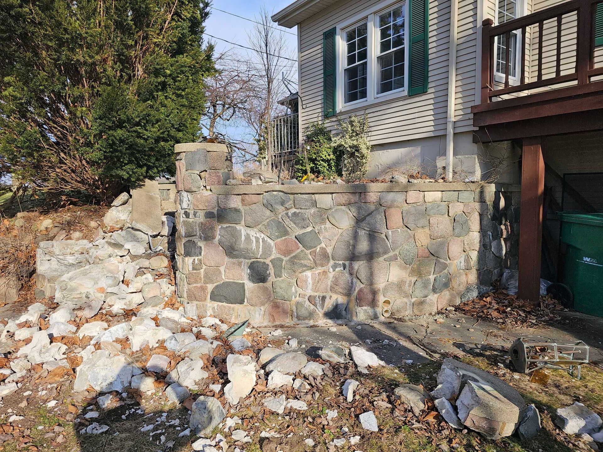 The damage to the wall required 8 feet to be demolished and rebuilt, with each stone being carefully removed and cleaned to keep the natural appearance.