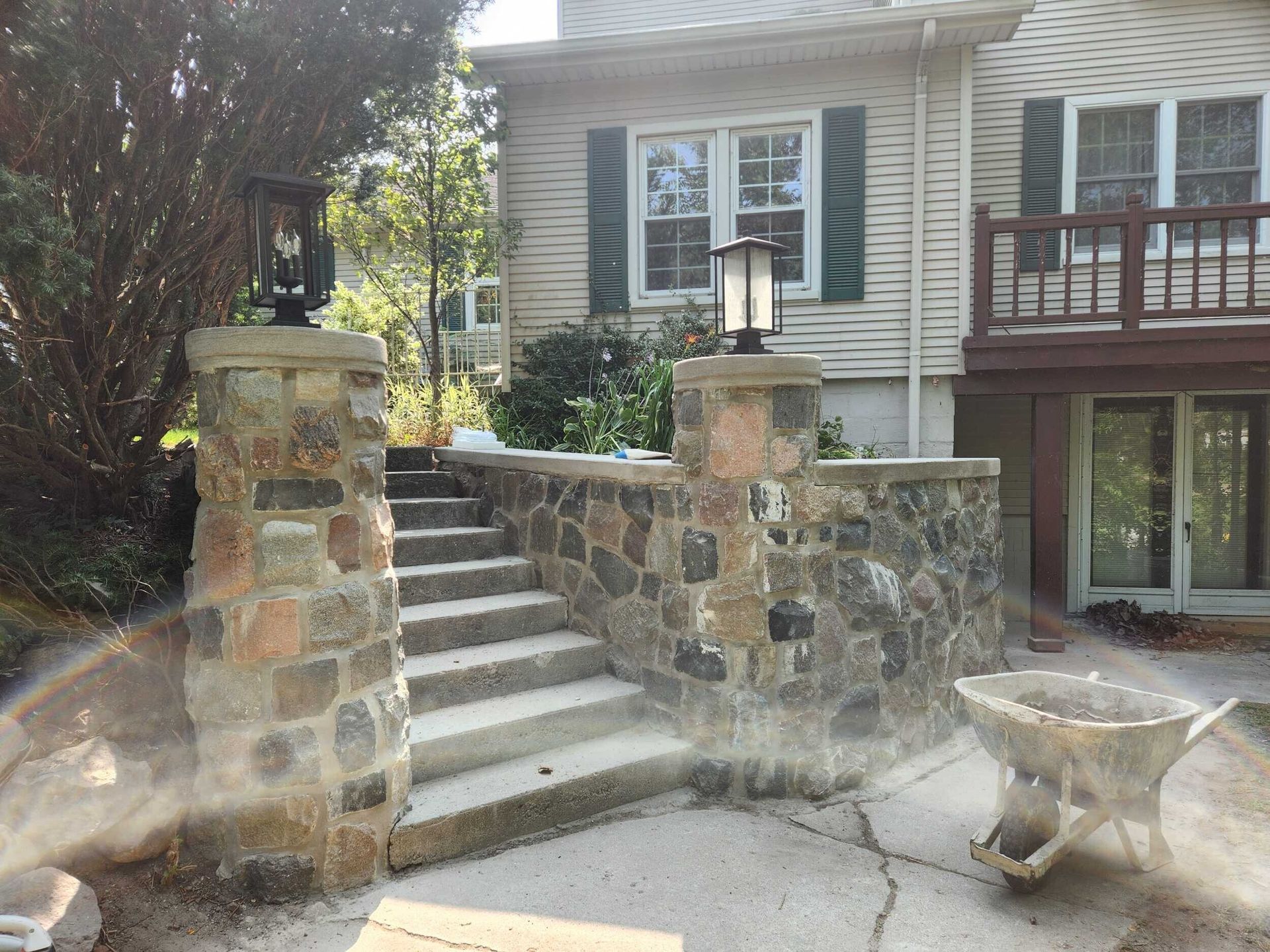 The masonry crew cleaned up the debris from the jobsite and was able to salvage nearly every stone to rebuild this beautiful natural stone retaining wall and walkway with steps.