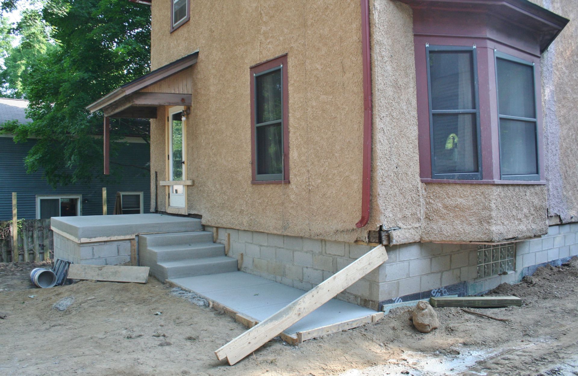 Poured concrete walkway, steps, and porch were also added accommodate the elevated back door.