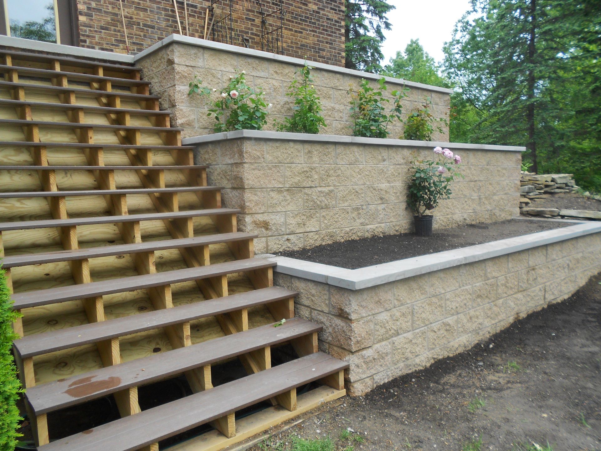The split faced block and limestone cap retaining wall replaced an existing wood a rotting wood retaining wall.