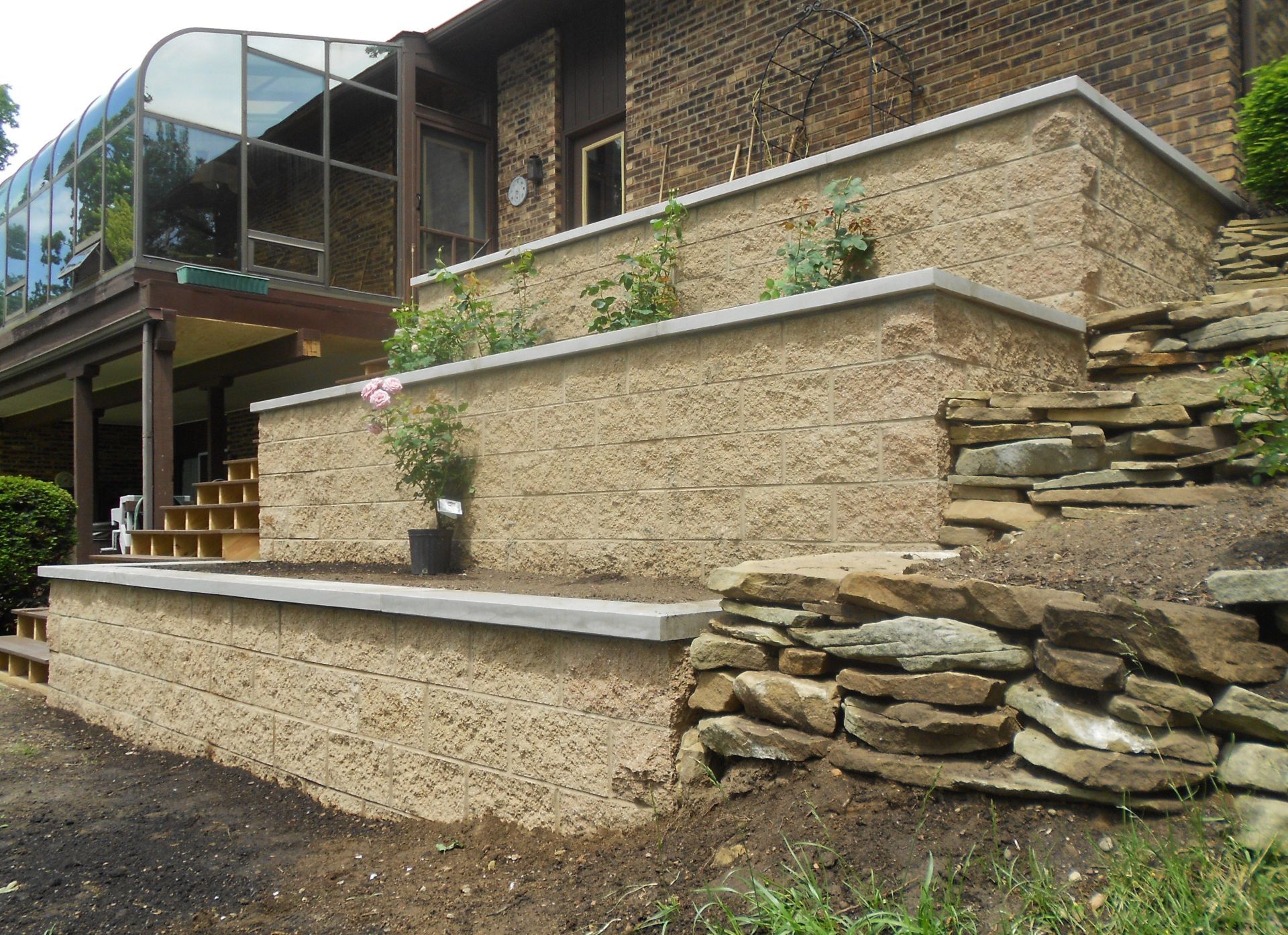 The limestone caps and split faced block of the retaining wall complement the existing brick home.